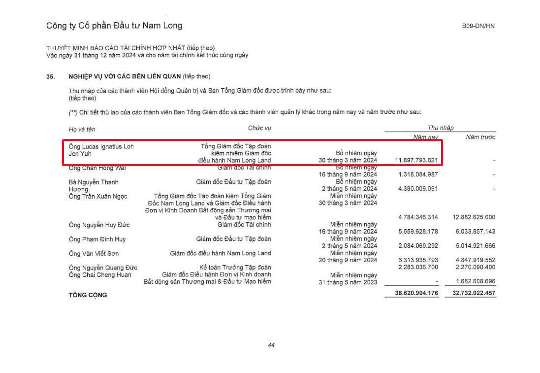 Người có thu nhập cao nhất Tập đoàn Nam Long trong năm qua là CEO Lucas Ignatius Loh Jen Yuh với gần 12 tỷ đồng, tương ứng 1 tỷ đồng/tháng. Xếp thứ 2 là ông Văn Viết Sơn - cựu CEO Nam Long Land (miễn nhiệm vào tháng 9/2024) với 6,3 tỷ đồng. Chủ tịch HĐQT Nguyễn Xuân Quang thu nhập 4,6 tỷ đồng.