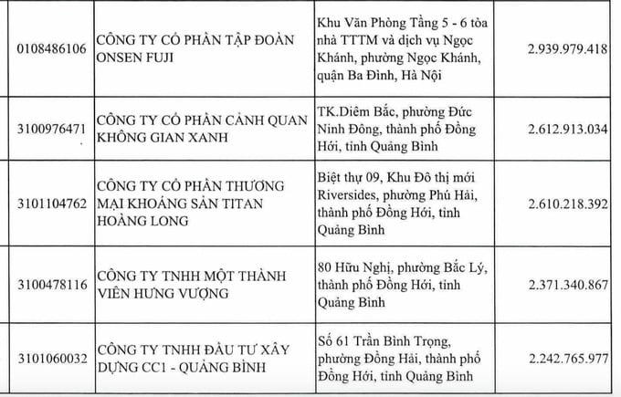 Ngoài Công ty Cổ phần Tập đoàn Onsen Fuji, Chi cục Thuế Khu vực XI cũng thực hiện công khai thông tin 77 người nộp thuế trên địa bàn tỉnh Quảng Bình còn nợ tiền thuế và các khoản thu khác thuộc ngân sách nhà nước tính đến thời điểm 30/4/2025, với tổng số tiền hơn 1.358,7 tỷ đồng.