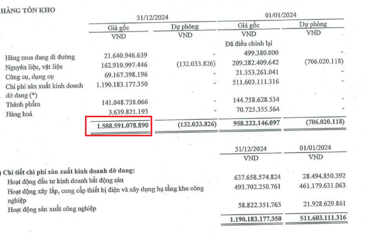 Đáng chú ý, hàng tồn kho tăng mạnh tới 63% so với đầu năm, ghi nhận tại 1.588 tỷ đồng.