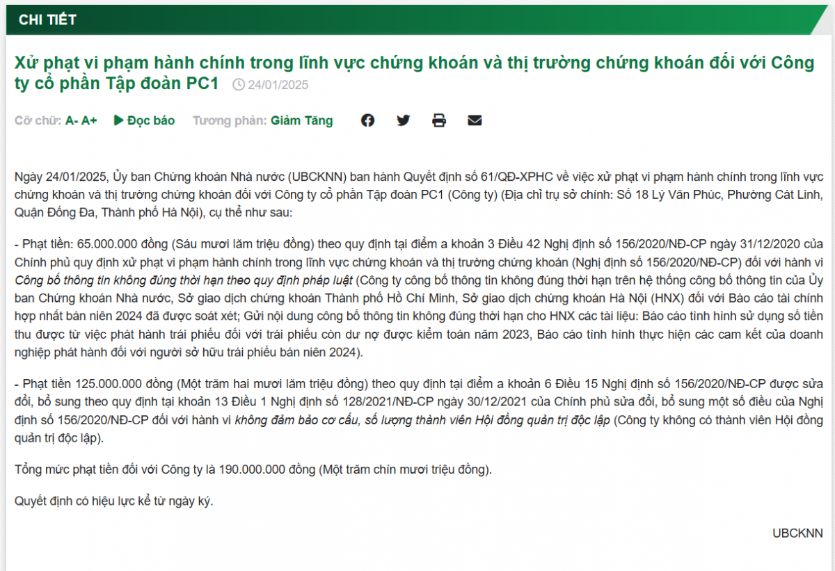 Thời điểm cuối tháng 1/2025, 01/2025, Ủy ban Chứng khoán Nhà nước (UBCKNN) đã ban hành quyết định xử phạt vi phạm hành chính trong lĩnh vực chứng khoán và thị trường chứng khoán đối với Công ty cổ phần Tập đoàn PC1.