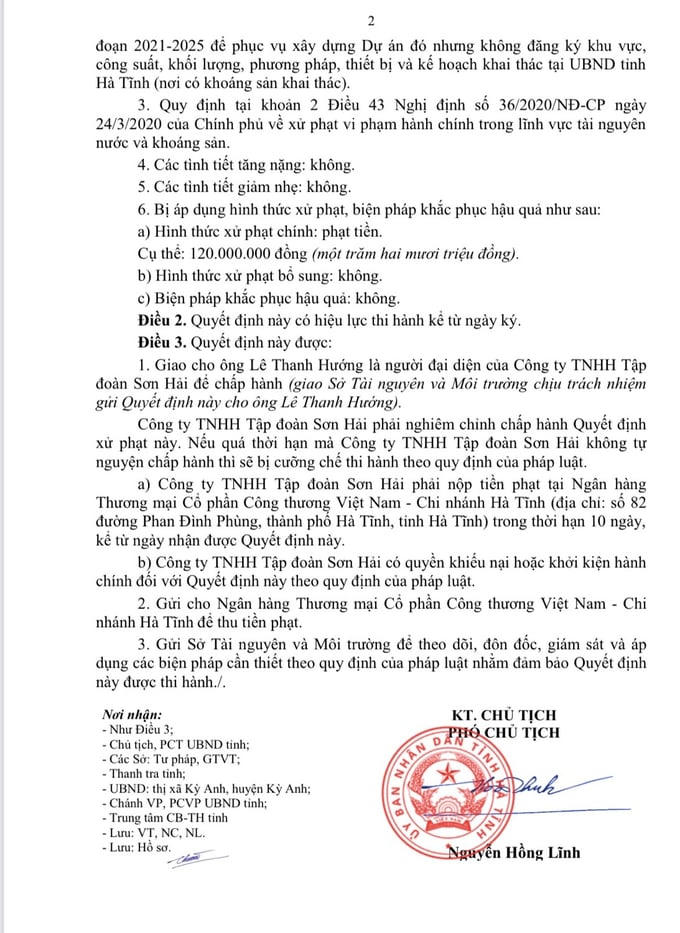 Căn cứ quy định tại khoản 2 Điều 43 Nghị định số 36/2020/NĐ-CP ngày 24/3/2020 của Chính phủ về xử phạt vi phạm hành chính trong lĩnh vực tài nguyên nước và khoáng sản, UBND tỉnh Hà Tĩnh quyết định xử phạt hành chính đối với Công ty TNHH Tập đoàn Sơn Hải số tiền 120 triệu đồng.