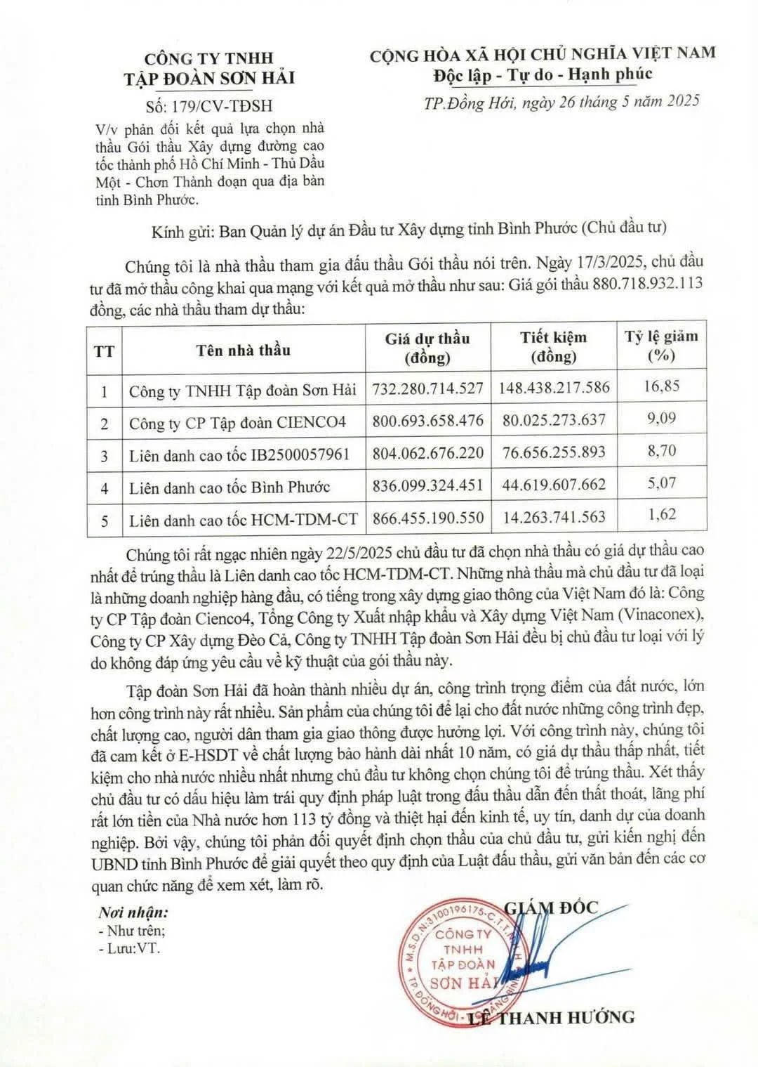 Ngày 26/5, Công ty TNHH Tập đoàn Sơn Hải (trụ sở tại Quảng Bình) đã gửi văn bản đến Ban Quản lý Dự án đầu tư xây dựng tỉnh Bình Phước, bày tỏ quan điểm không đồng tình với kết quả lựa chọn nhà thầu thi công gói thầu thuộc dự án cao tốc TP.HCM - Thủ Dầu Một - Chơn Thành, đoạn đi qua địa phận tỉnh Bình Phước.