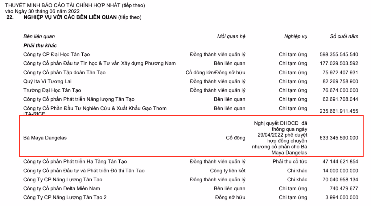 Công ty cổ phần Đầu tư và Công nghiệp Tân Tạo (ITA) mới công bố lại báo cáo tài chính hợp nhất quý II/2022 vì trước đó "hạch toán sai". Biến động lớn nhất giữa báo cáo mới và cũ là số tiền cũng như mục đích doanh nghiệp này tạm ứng cho Chủ tịch Đặng Thị Hoàng Yến (hay còn gọi là Maya Dangelas).