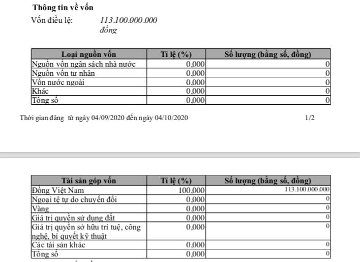 Tại ngày cấp đăng ký thay đổi 4/9/2020, thông tin về vốn điều lệ của công ty được hé lộ. Theo đó, thời điểm này công ty giảm vốn điều lệ từ 113,1 tỷ đồng xuống còn 95,8 tỷ đồng; cổ đông góp vốn không được đề cập.