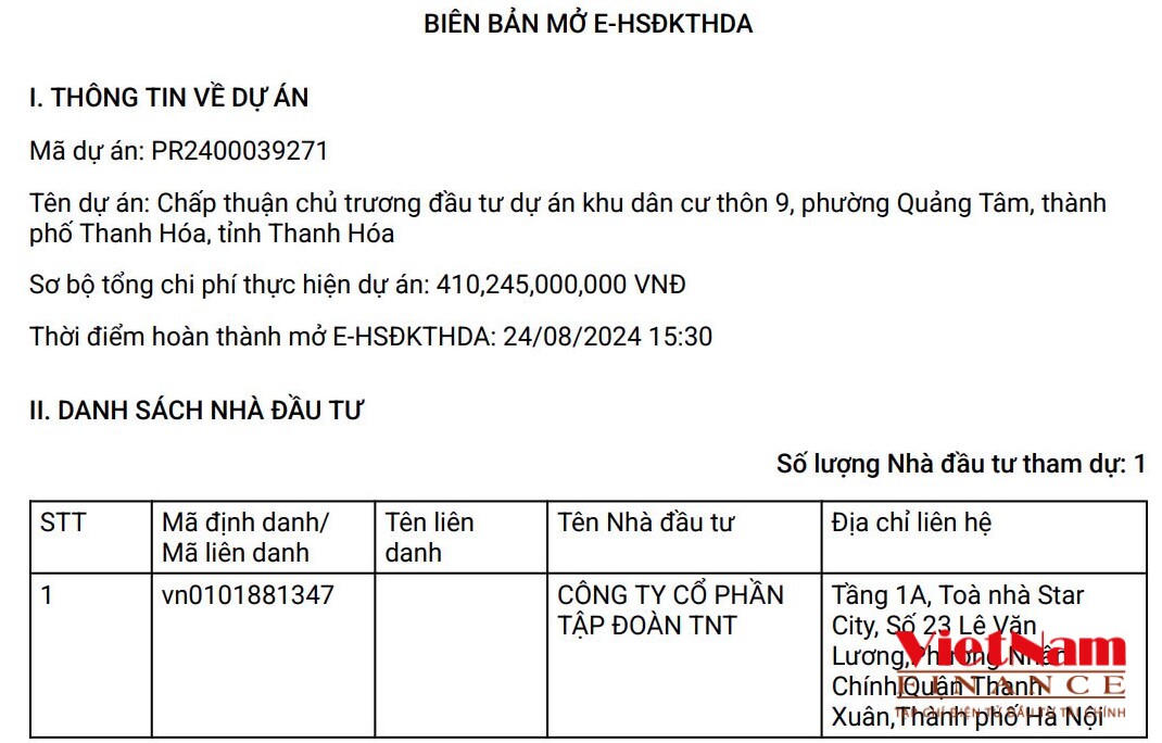 Sở Kế hoạch và Đầu tư tỉnh Thanh Hoá đóng/mở hồ sơ đăng ký thực hiện dự án Khu dân cư mới tại phường Quảng Tâm, TP.Thanh Hoá, tỉnh Thanh Ho, xác định có duy nhất 1 nhà đầu tư quan tâm nộp hồ sơ đăng ký thực hiện là Công ty cổ phần Tập đoàn TNT.