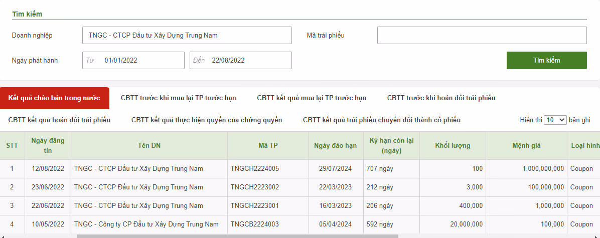 Theo thông tin công bố trên Cbons.hnx, lô trái phiếu mới nhất trị giá 100 tỷ đồng được Trung Nam Group huy động thành công vào ngày 29/7/2022.