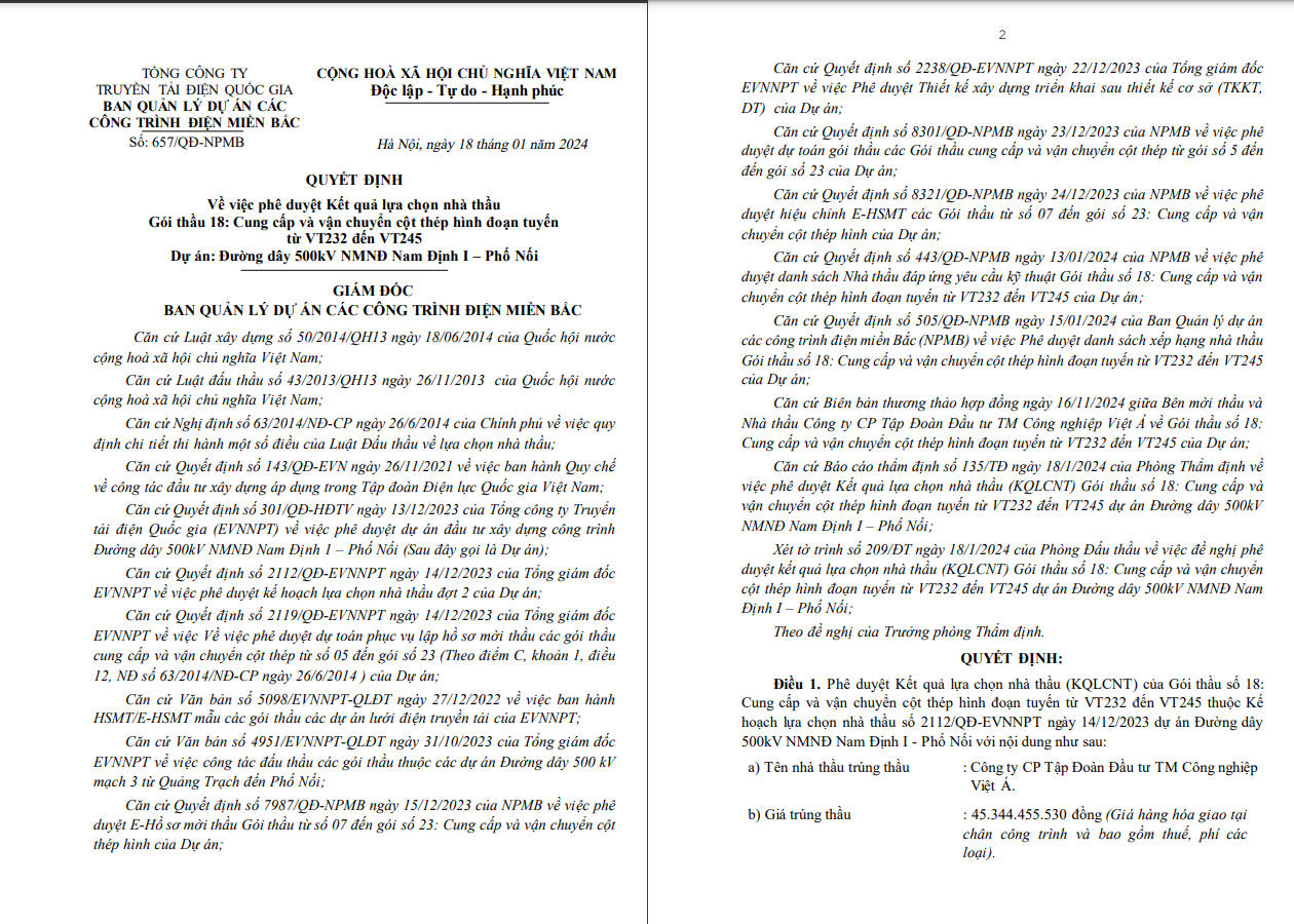 Tính riêng trong hai tháng đầu năm 2024 (tháng 1và tháng 2/2024, Tập đoàn Công nghiệp Việt Á trúng tổng cộng tới 10 gói thầu tại Ban QLDA các công trình điện Miền Bắc và Ban QLDA các công trình điện Miền Trung.