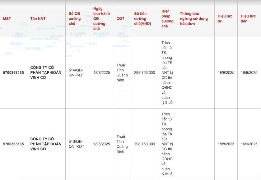 Ngày 18/8/2025, Thuế tỉnh Quảng Ninh ban hành 4 quyết định cưỡng chế bằng biện pháp trích tiền từ tài khoản, phong toả tài khoản đối với Công ty cổ phần Tập đoàn Vĩnh Cơ (gọi tắt Tập đoàn Vinh Cơ).
