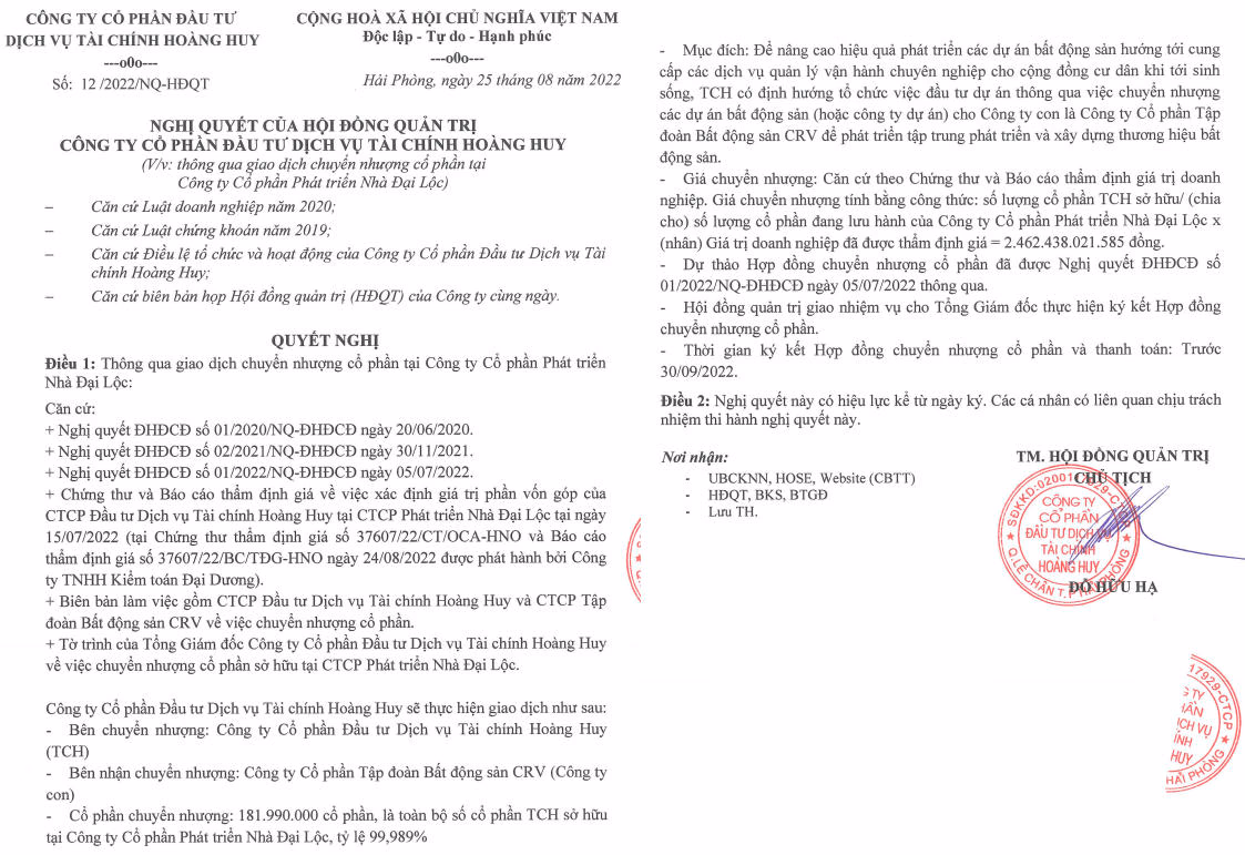 Tài chính Hoàng Huy muốn chuyển nhượng toàn bộ cổ phần tại Nhà Đại Lộc cho một công ty con khác là Tập đoàn Bất động sản CRV để thu về hơn 2.400 tỷ đồng ngay trong quý 3.