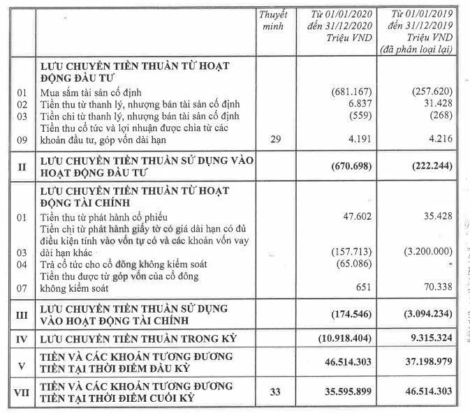 Ngoài ra, lưu chuyển tiền thuần từ hoạt động đầu tư cũng âm gần 671 tỷ đồng trong khi cùng kỳ chỉ âm hơn 222 tỷ đồng. Lưu chuyển tiền thuần trong kỳ âm hơn 10.918 tỷ đồng trong khi cùng kỳ âm 9.315 tỷ đồng.