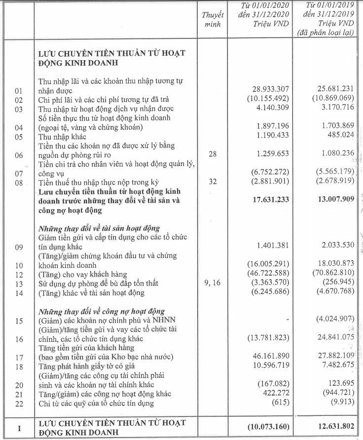 Kết thúc ngày 31/12/2020, dòng tiền thuần từ hoạt động kinh doanh tại Techcombank trong năm 2020 âm đến 10.073 tỷ đồng, trong khi năm trước dương 12.632 tỷ đồng.
