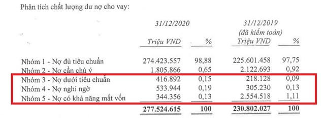 Tuy nhiên, điều đáng quan ngại chính là nợ nhóm 3 tại Techcombank lại tăng mạnh 91% so với đầu năm, lên mức 417 tỷ đồng và nợ nhóm 4 cũng tăng lên 75%, đạt gần 534 tỷ đồng.