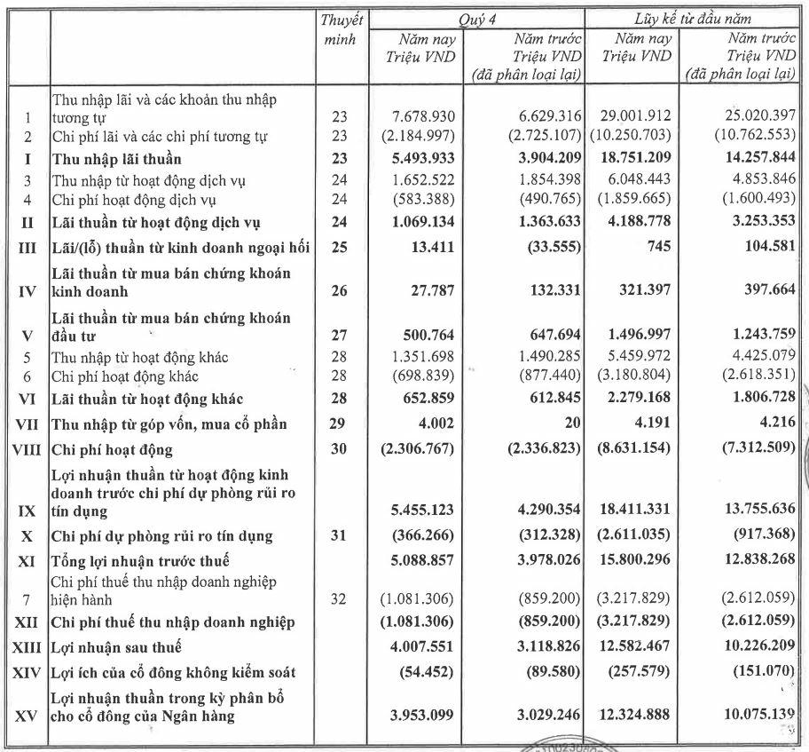 Ngân hàng TMCP Kỹ thương Việt Nam (Techcombank - Mã: TCB) công bố báo cáo tài chính hợp nhất quý 4/2020 với lợi nhuận trước thuế năm 2020 đạt 15.800 tỷ đồng và lãi sau thuế đạt 12.582 tỷ đồng, tăng 23% so với năm 2019, cao hơn chỉ tiêu lợi nhuận trước thuế mà Đại hội cổ đông đã thông qua là 21,5%. Lãi sau thuế cổ đông ngân hàng mẹ tăng 22% lên mức 12,325 tỷ đồng.