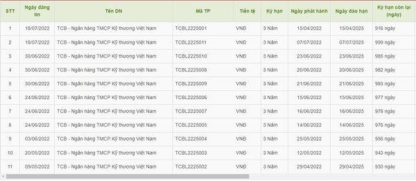 Cụ thể, từ ngày 29/4/2022 đến ngày 15/7/2022, Techcombank đã hoàn tất phát hành các lô trái phiếu TCBL2225001, TCBL2225002, TCBL2225003, TCBL2225004, TCBL2225005, TCBL2225006, TCBL2225007, TCBL2225008, TCBL2225009, TCBL2225010 và TCBL2225011. Tất cả các lô trái phiếu này đều có kỳ hạn 36 tháng, đáo hạn từ tháng 4 - 7/2025.