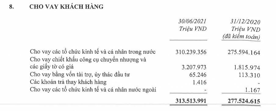 Cho vay khách hàng tăng chủ yếu từ khoản cho vay chiết khẩu công cụ chuyển nhượng và các giấy tờ có giá đạt 3.208 tỷ đồng, tương đương tăng 77% so với đầu năm và cho vay các tổ chức kinh tế, cá nhân trong nước tăng 13%, ở mức hơn 310.239 tỷ đồng.