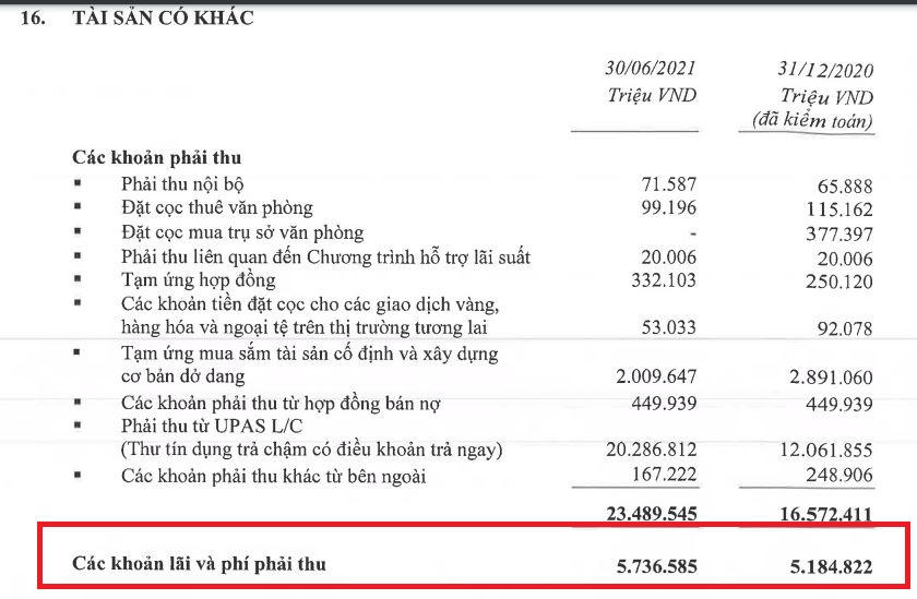 Cũng tại thời điểm cuối tháng 6/2021, lãi dự thu (nguồn lãi ảo) tại Techcombank tăng 11%, ghi nhận hơn 5.736 tỷ đồng.