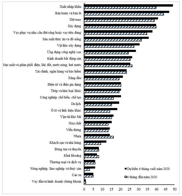 Các ngành nghề được cho là động lực tăng trưởng tín dụng của hệ thống trong 6 tháng đầu năm 2020 là lĩnh vực bán buôn, bán lẻ, xuất nhập khẩu, xây dựng và dệt may. Dự kiến trong 6 tháng cuối năm 2020, 49% TCTD kỳ vọng xuất nhập khẩu sẽ là động lực tăng trưởng tín dụng của hệ thống, tiếp đến là bán buôn, bán lẻ (47%); dệt may (41%) và xây dựng (40%).