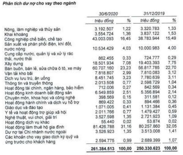 Ngoài ra, SHB cũng đang rót vốn mạnh vào ngành bán buôn, bán lẻ với dư nợ cho vay đạt 54.045 tỷ đồng, tăng 21% so với đầu năm, chiếm tỷ trọng 18,8% trong cơ cấu ngành. Hay Sacombank với dư nợ cho vay đạt 30.149 tỷ đồng, tăng 4% so với đầu năm, chiếm tỷ trọng 10% trong cơ cấu ngành.