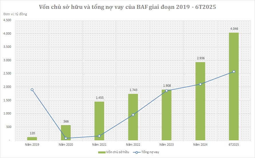 Có vẻ như BAF không thiếu tiền khi liên tục tăng vốn thành công để đáp ứng nhu cầu mở rộng. Cứ mỗi khi dư địa vay nợ cạn dần, BAF lại tăng vốn chủ sở hữu và dư địa vay nợ lại “nở ra”. Nếu như cuối năm 2021, vốn chủ sở hữu chỉ ở mức 1.455 tỷ đồng thì đến năm 2024 đã tăng gấp đôi và đến cuối tháng 6/2025 đã tăng gần gấp ba, đạt 4.046 tỷ đồng.