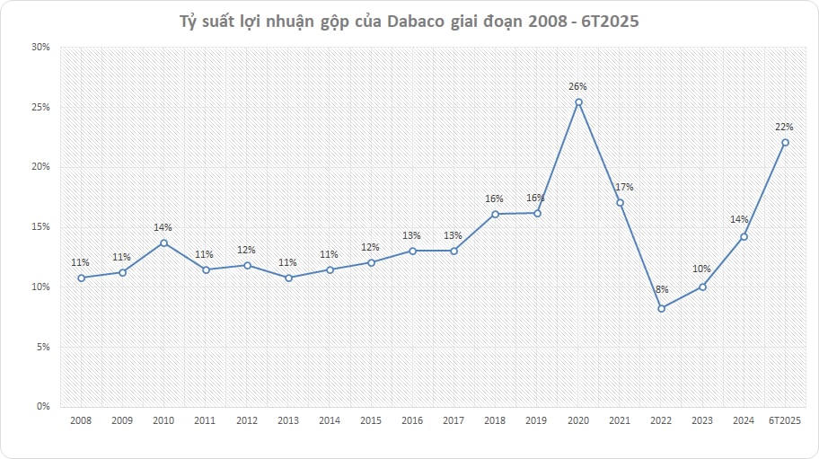 Hiện tượng này có thể dễ dàng thấy được khi nhìn vào tỷ suất lợi nhuận gộp của Dabaco - một doanh nghiệp kinh doanh heo lâu năm. Suốt giai đoạn 2008 - 2019, tỷ suất lợi nhuận gộp của Dabaco có xu hướng tăng. Điều này là dễ hiểu bởi qua thời gian, các doanh nghiệp lớn như Dabaco sẽ liên tục tối ưu để tăng tỷ suất lợi nhuận gộp thông qua tối ưu hóa quy trình, ứng dụng công nghệ… Tuy nhiên, bước sang giai đoạn 2020 - 6 tháng 2025, tỷ suất lợi nhuận gộp trồi sụt thấy rõ.