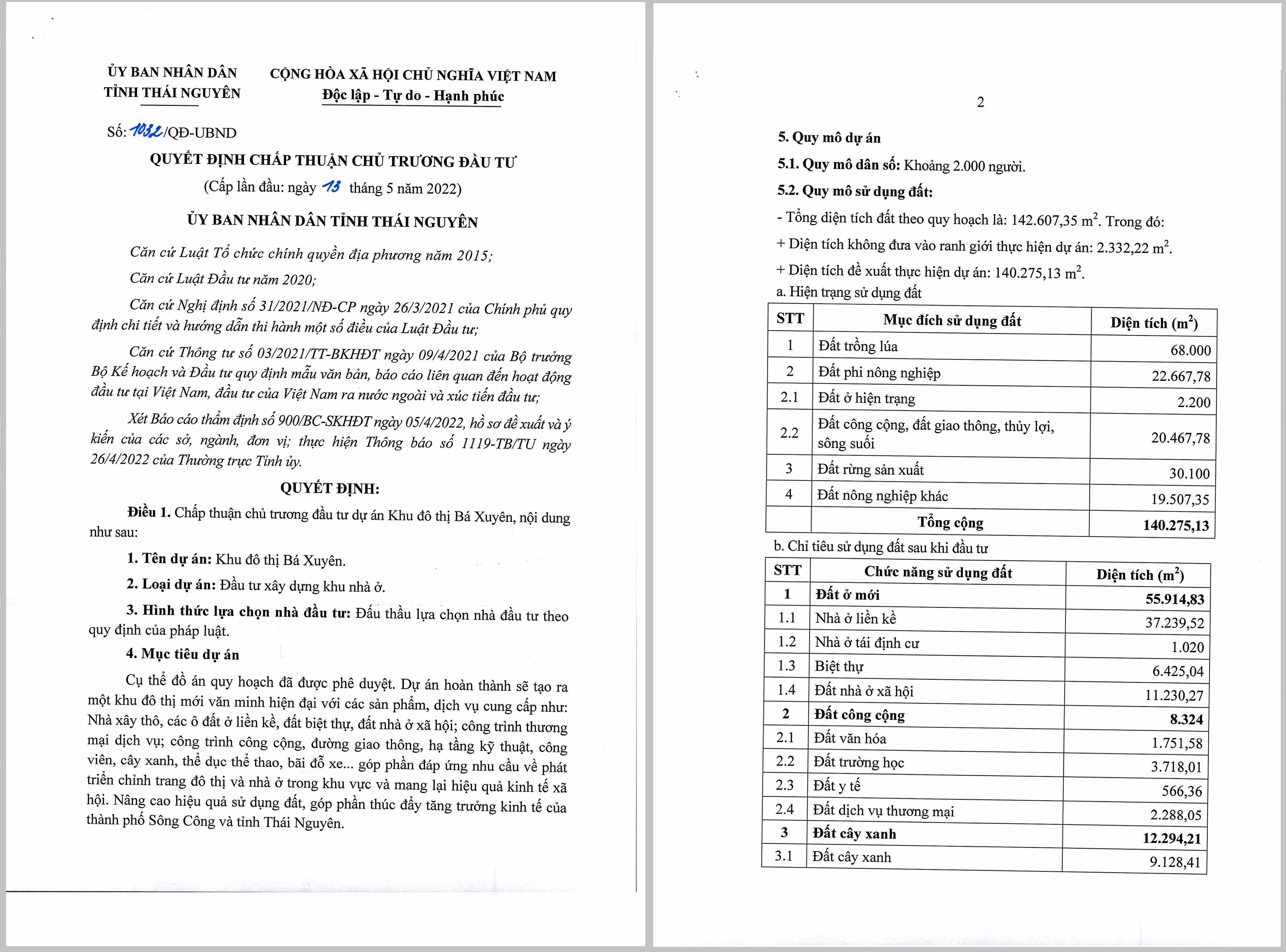 Dự án với tổng số lô đất ở là 436 gồm 29 lô đất ở biệt thự và 407 lô đất ở liền kề (chưa bao gồm đất ở tái định cư). Sơ bộ chi phí thực hiện dự án không bao gồm chi phí bồi thường, hỗ trợ, tái định cư: 260,86 tỷ đồng. Địa điểm thực hiện tại xã Bá Xuyên, thành phố Sông Công. Tiến độ dự kiến từ quý II/2022 đến quý II/2024.
