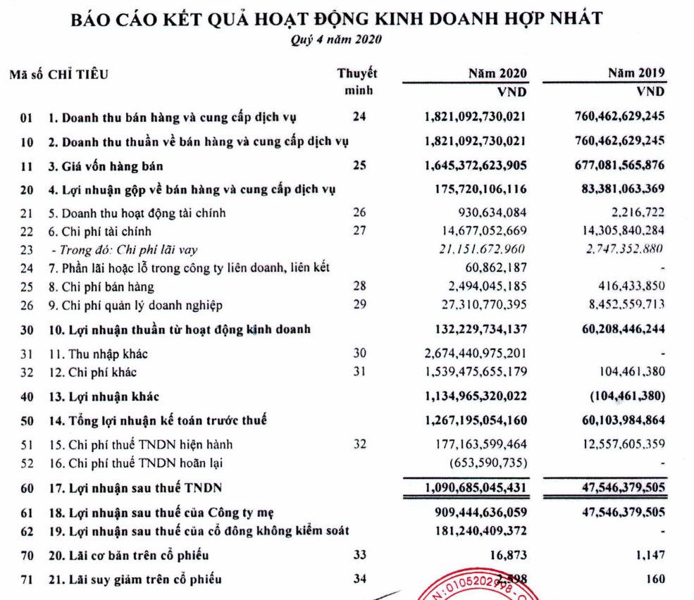 Mới đây, CTCP Thaiholdings (Thaiholdings – Mã CK: THD) vừa công bố báo cáo kết quả kinh doanh năm 2020 với doanh thu thuần đạt 1.821 tỷ đồng, tăng 140% so với cùng kỳ. Lãi sau thuế hợp nhất năm 2020 đạt gần 1.091 tỷ đồng, cao gấp 22,9 lần so với năm 2019. Đây là mức lãi cao nhất trong vòng 3 năm trở lại đây của Thaiholdings.