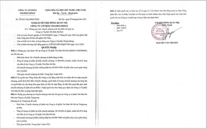 Theo thông tin được công bố của Hội đồng quản trị (HĐQT) CTCP ThaiHoldings (mã chứng khoán: THD), công ty quyết định sẽ chuyển nhượng 14,2 triệu cổ phần tại một công ty con là CTCP Tôn Đản Hà Nội, tương ứng với 19,52% vốn điều lệ. Giá chuyển nhượng tối thiểu là 60.000/cp. Thời gian chuyển nhượng dự kiến trong quý IV/2021.