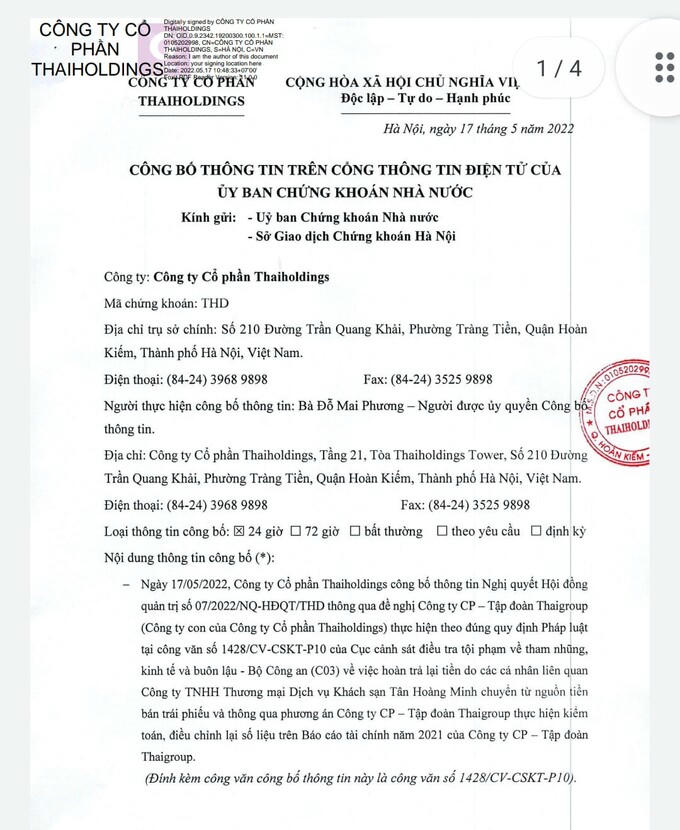 Theo đó, chấp hành công văn số 1428/CV-CSKT-P10 của Cục cảnh sát điều tra tội phạm về tham nhũng, kinh tế và buôn lậu Bộ Công an (C03), Thaiholdings thông qua phương án CTCP – Tập đoàn Thaigroup (Công ty con của Thaiholdings) hoàn trả số tiền đã giao dịch từ Công ty TNHH Thương mại dịch vụ Khách sạn Tân Hoàng Minh theo đúng quy định của pháp luật.