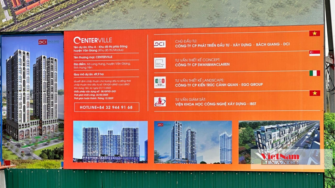 Ngày 26/2, tại xã Long Hưng, huyện Văn Giang, tỉnh Hưng Yên, Công ty Cổ phần Phát triển Đầu tư – Xây dựng Bách Giang (DCI) đã khởi công Khu đô thị phía Đông huyện Văn Giang, còn được biết đến với tên thương mại là Centerville (tên cũ Khu đô thị Modus).Centerville tọa lạc tại trung tâm xã Long Hưng, với diện tích quy hoạch hơn 49,9ha, đáp ứng cho khoảng 18.300 cư dân.Dự án Centerville nằm đối diện với khu Vinhomes Ocean Park 2 qua đường cao tốc Hà Nội - Hải Phòng, tuyến đường kết nối Thủ đô với các tỉnh Hưng Yên, Hải Dương, Hải Phòng.Trong đó, diện tích dành cho đất ở hơn 17,87ha (35,82%) với 3 tòa nhà cao 39 tầng, đất cho nhà ở xã hội 15.961,45m2, đất biệt thự khoảng 61.863m2 và đất nhà ở lền kề khoảng 59.772m2; diện tích dành công trình công cộng chiếm 46.507,29m2 (9,32%); diện tích đất cây xanh mặt nước gần 11,89ha (23,84%), đất giao thông 15,48ha (31,02%), đất ngoài điều chỉnh gần 43.302m2… Dự kiến dự án sẽ hoàn thành vào năm 2029.Dự án có quy mô vôn đầu tư lên tới 17.000 tỷ đồng, do Công ty Cổ phần phát triển đầu tư - xây dựng - Bách Giang - DCI.Theo tìm hiểu, Bách Giang DCI được thành lập từ năm 2004, do bà Trịnh Thị Hà là Chủ tịch HĐQT. Tháng 5/2023, Bách Giang DCI sáp nhập Công ty cổ phần Đầu tư Thủy Hòa và Revital Việt Nam. Sau sáp nhập, công ty đã tăng vốn điều lệ từ 2.652 tỷ đồng lên 3.542 tỷ đồng.Ngoài là Chủ tịch HĐQT Bách Giang DCI, bà Trịnh Thị Hà còn được biết đến là người đại diện loạt doanh nghiệp nằm trong "hệ sinh thái" của Tây Giang Group.Theo ghi nhận của VietnamFinance, sau khu dự án được khởi công, xung quang khu đất đã được dựng hàng rào tôn bảo vệ.Tuy nhiên bên trong khu vực dự án Centerville vẫn là khu đất hoang hoá, ngoài ra cũng ko có các thiết bị máy móc phục vụ cho việc xây dựng.Hiện trạng khu đất gần 50ha dự án Centerville tại xã Hưng Long, huyện Văn Giang, tỉnh Hưng Yên.Vị trí dự án nằm khá gần với các đại đô thị như Ecopark, Vinhomes Ocean Park 1, 2 và 3.Toàn cảnh dự án Centerville nằm tiếp giáp với cao tốc Hà Nội - Hải Phòng