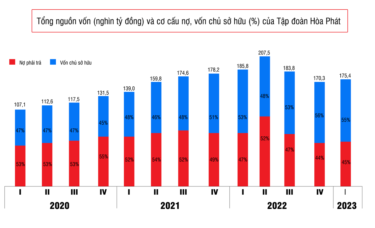 Có một điểm trừ trong quý đầu năm 2023 của Hòa Phát đó là nợ phải trả của Hòa Phát tăng thêm 4.748 tỷ đồng lên mức 78.970 tỷ đồng. Tổng giá trị nợ vay là 60.600 tỷ đồng, trong đó vay ngắn hạn là 50.354 tỷ đồng, chiếm 83% tổng nợ vay và còn lại là hơn 10.300 tỷ đồng vay dài hạn.