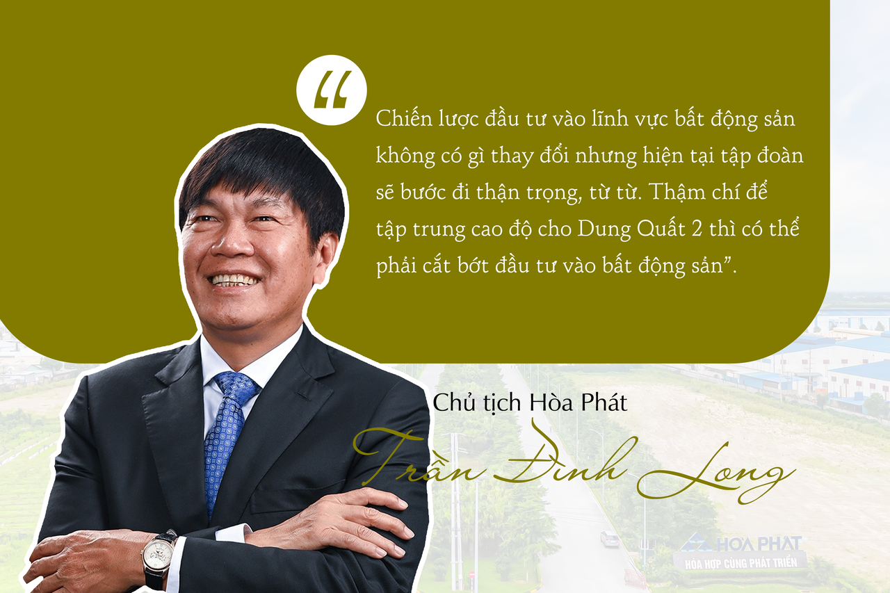 Tuy nhiên, mới đây, Chủ tịch HĐQT CTCP Tập đoàn Hòa Phát (mã CK: HPG) Trần Đình Long một lần nữa khẳng định Hòa Phát vẫn kiên định chiến lược kinh doanh đa ngành, nhưng hiện tại ưu tiên tập trung cho mảng thép và dự án Dung Quất 2, nên có thể tạm gác lại tham vọng vào lĩnh vực bất động sản và một số mảng lĩnh vực khác.