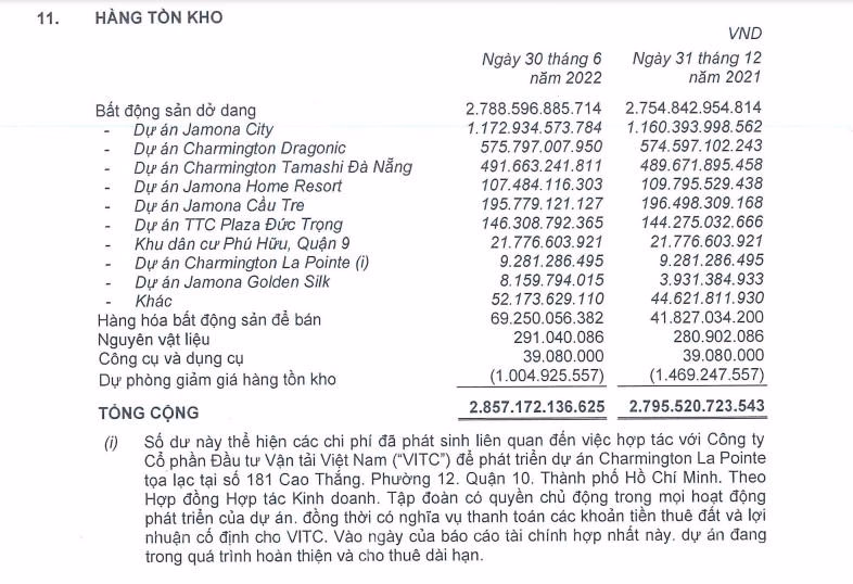 Giá trị hàng tồn kho đến cuối kỳ của công ty ghi nhận hơn 2.857 tỷ đồng, chiếm gần một nửa là bất động sản dở dang (gồm chi phí đầu tư và phát triển) của dự án Jamona City với giá trị 1.172 tỷ đồng. Ngoài ra, công ty còn ghi nhận hơn 986,3 tỷ đồng khoản người mua trả tiền trước, đây là khoản nhận tạm ứng theo tiến độ hợp đồng từ khách hàng mua nhà và căn hộ thuộc các dự án đang được thi công xây dựng.