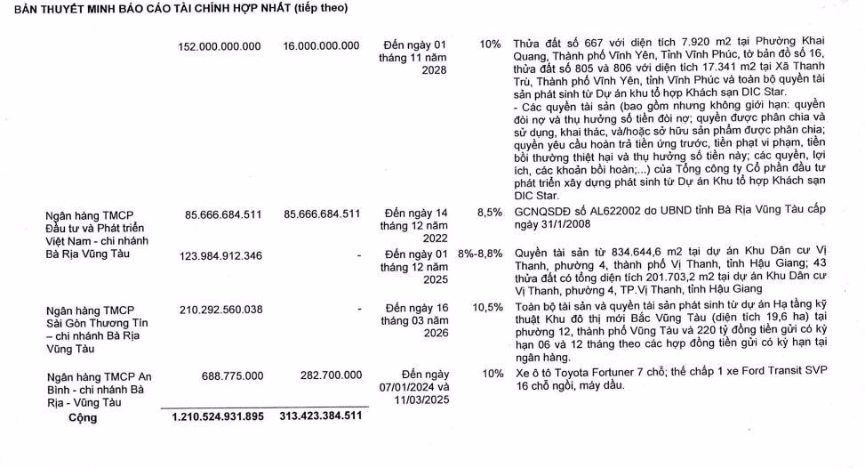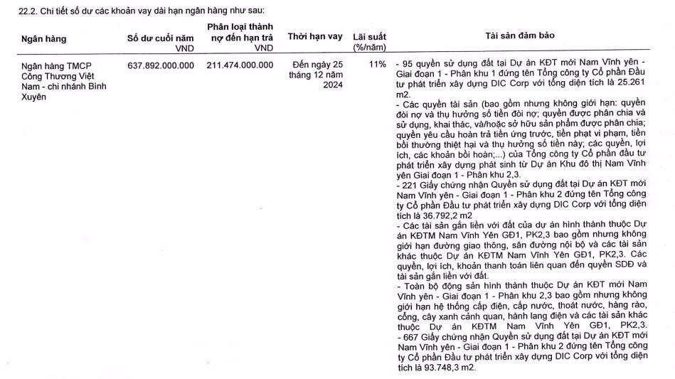 Cụ thể, về các khoản vay dài hạn, ngân hàng Vietinbank là chủ nợ lớn nhất cho vay gần 638 tỷ đồng với lãi suất 11%, thời hạn vay đến tháng 12/2024. Tài sản đảm bảo cho khoản vay là dự án KĐT mới Nam Vĩnh Yên. Vietinbank cũng cho vay 152 tỷ đồng lãi suất 10% thời hạn vay đến năm 2028. Tải sản đảm bảo là thửa đất số 667 với diện tích 7.920m2 tại Tp Vĩnh Yên, Vĩnh Phúc và toàn bộ quyền tài sản phát sinh từ dự án khu tổ hợ khách sạn DIC Star.
