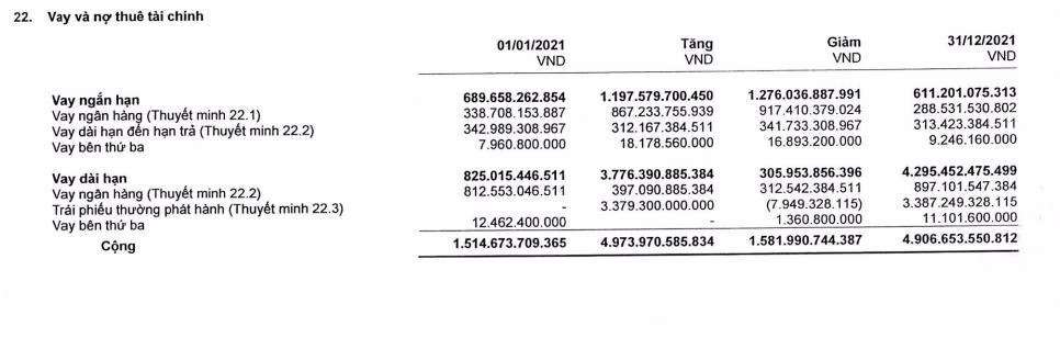 Do tăng cường hoạt động vay nợ, số dư nợ vay dài hạn tăng từ 825 tỷ đồng hồi đầu năm lên mức hơn 4.295 tỷ đồng tính đến 31/12/2021, tương đương tăng vọt 421%; nợ vay ngắn hạn chỉ giảm nhẹ còn hơn 611 tỷ đồng.