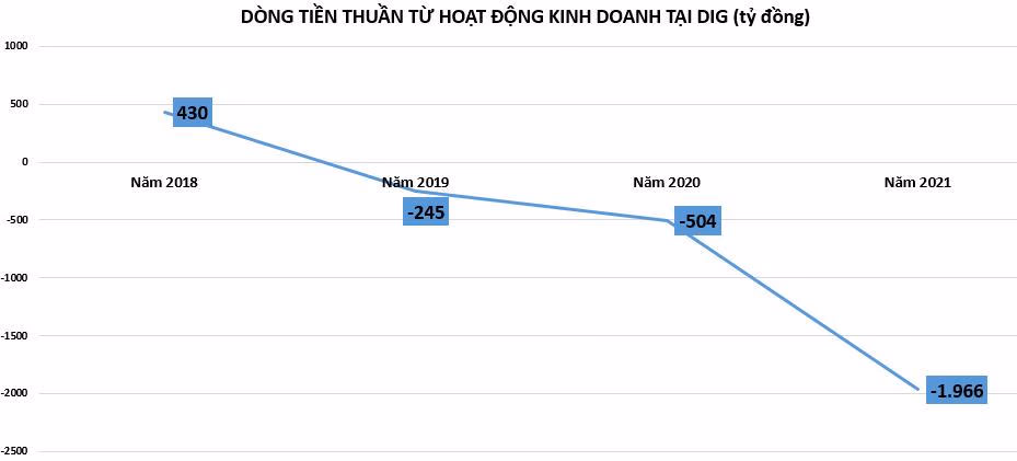 Cụ thể, năm 2021, dòng tiền thuần từ hoạt động kinh doanh của DIG âm hơn 1.966 tỷ đồng trong khi năm 2020 chỉ âm hơn 504 tỷ đồng. Ngoài ra, dòng tiền thuần từ hoạt động tài chính cũng âm hơn 2.767 tỷ đồng, năm 2020 chỉ âm hơn 19 tỷ đồng.