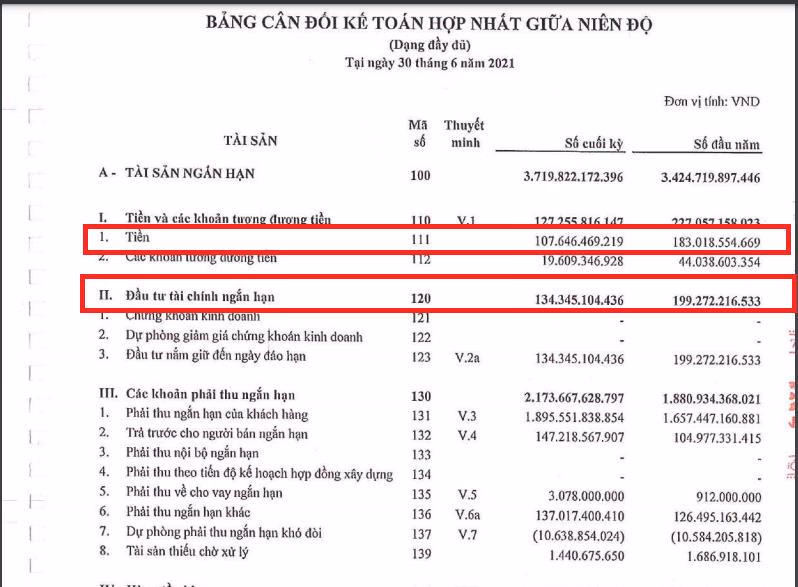 Tính đến cuối tháng 6/2021, tổng tài sản của Sơn Hà đạt 4.800 tỷ đồng, tăng 6,6% so với hồi đầu năm. Tuy nhiên, “kho tiền mặt” của doanh nghiệp giảm mạnh, chỉ còn 107 tỷ đồng, giảm 41,5% so với con số đầu năm. Bên cạnh đó, khoản mục đầu tư tài chính ngắn hạn cũng giảm, chỉ còn 134 tỷ đồng, tương ứng giảm 32,6% so với đầu năm.