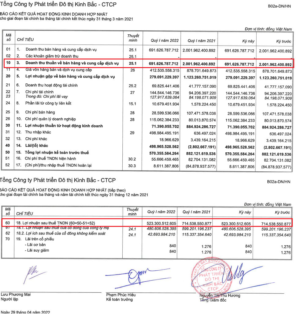 Theo báo cáo thường niên 2022, Ban Tổng giám đốc Đô thị Kinh Bắc đề ra kế hoạch kinh doanh năm 2022 gồm tổng doanh thu hợp nhất 9.800 tỷ đồng, lợi nhuận hợp nhất sau thuế 4.500 tỷ đồng. Như vậy, kết thúc quý I, doanh thu đạt 7,1% còn lợi nhuận hoàn thành 11,6% mục tiêu cả năm.