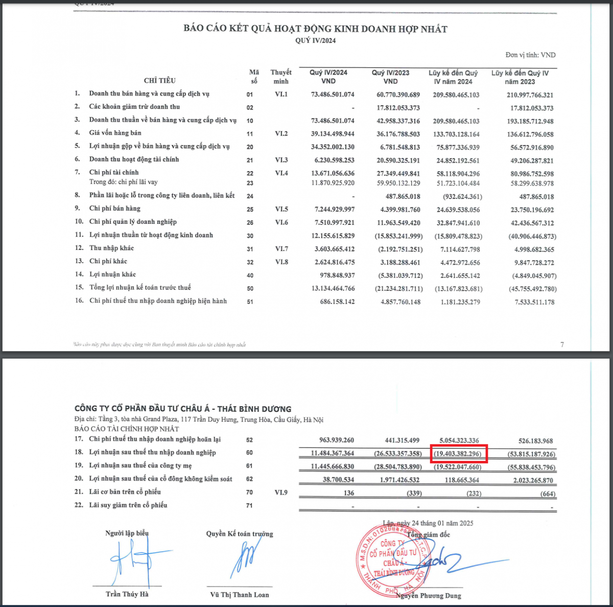 Trong quý IV năm 2024, API ghi nhận doanh thu thuần hợp nhất đạt hơn 75 tỷ tăng trưởng 71% so với cùng kỳ năm trước. Nhờ vào việc cải thiện biên lợi nhuận gộp, công ty đã chuyển từ lỗ 26 tỷ trong cùng kỳ năm trước sang lãi 11 tỷ đồng. Nguyên nhân chính cho sự tăng trưởng này là do phát sinh doanh thu từ việc bàn giao và bán mới dự án Aqua Park Bắc Giang.