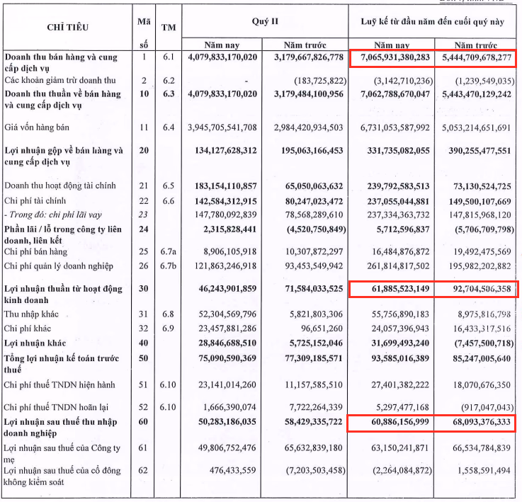 Ngoài ra, quy mô vay tài chính của doanh nghiệp cũng có xu hướng tăng mạnh trong giai đoạn này. Vay và nợ thuê tài chính ngắn hạn trong nửa đầu năm tăng từ 4.699 tỷ đồng lên 5.461 tỷ đồng (tăng 16,2%); vay và nợ thuê tài chính dài hạn tăng từ 398 tỷ đồng đầu năm lên 1.074 tỷ đồng vào giữa năm (tăng 170%).