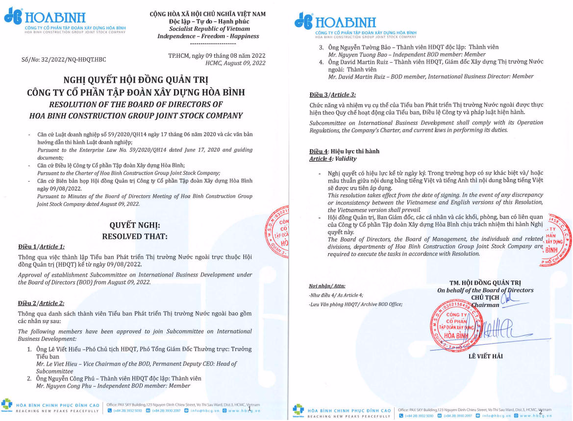 Trong đó, ông Lê Viết Hiếu là con trai ông Lê Viết Hải – Chủ tịch HĐQT. Ông Hiếu được đào tạo ở nước ngoài với bằng Cử nhân Quản trị kinh doanh - Đại học California Polytechnic (Mỹ). Trước khi giữ chức vụ Phó Chủ tịch HĐQT HBC, ông Hiếu đã từng trải gnhiệm ở vị trí Phó Giám đốc, Giám đốc Phát triển thị trường nước ngoài của Tập đoàn Xây dựng Hòa Bình, trong giai đoạn từ năm 2016 đến năm 2019.