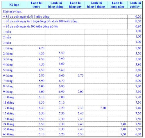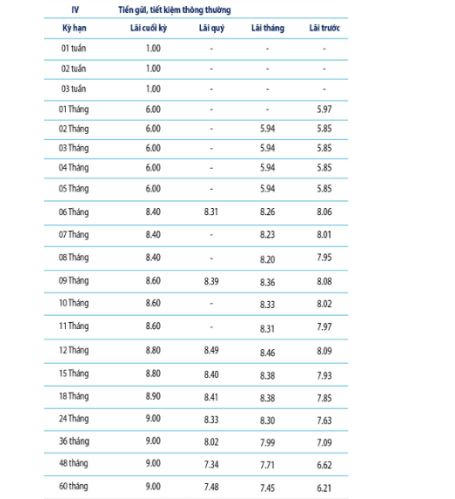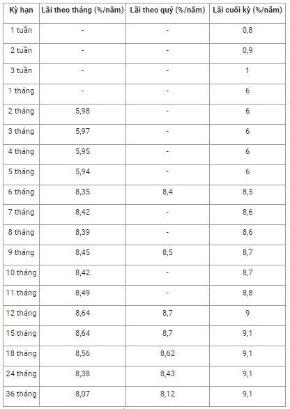 Bên cạnh đó, lĩnh lãi hàng tháng giảm 0,4 - 0,9 điểm % xuống 5,94 - 9,08%/năm; lĩnh lãi hàng quý giảm 0,4 - 0,6 điểm % xuống 6 - 9,1%/năm; và lĩnh lãi trước giảm 0,3 - 0,8 điểm % xuống 5,85 - 8,8%/năm.
