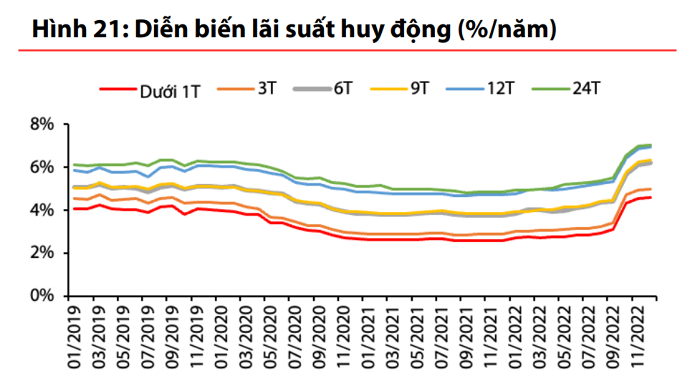 Trong báo cáo triển vọng 2023 vừa công bố, Công ty chứng khoán Rồng Việt (VDSC) dự báo lãi suất huy động tại các ngân hàng sẽ tiếp tục có sự phân hóa do: cạnh tranh lãi suất giữa các Ngân hàng thương mại cổ phần để giải quyết vấn đề thanh khoản; cạnh tranh thu hút tiền gửi trong bối cảnh dòng tiền nhàn rỗi chấp nhận dịch chuyển đến nơi có lãi suất tiền gửi thấp hơn để hạn chế rủi ro.