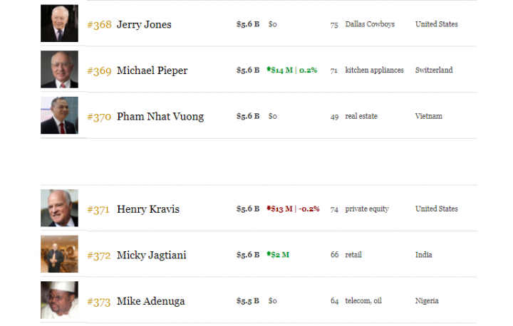 Bảng xếp hạng hiện tại của Forbes còn cho thấy, ông Vượng đang xếp trên tỷ phú Mỹ gốc Do Thái Henry Kravis, đồng sáng lập Công ty Kohlberg Kravis Roberts & Co (KKR), tỷ phú Micky Jagtiani – chủ sở hữu và cũng là người sáng lập ra Landmark Group, một trong những công ty bán lẻ lớn nhất ở Ấn Độ và Trung Đông.