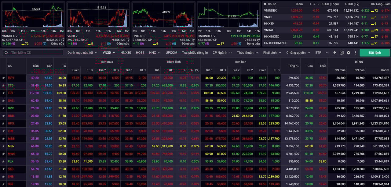 Chốt phiên, VN-Index dừng ở 1.226,3 điểm, giảm nhẹ 0,5 điểm so với tham chiếu. Mặc dù thanh khoản có cải thiện đôi chút so với buổi sáng, tổng giá trị giao dịch trên HoSE vẫn ở mức thấp, chỉ đạt hơn 15.500 tỷ đồng. Dòng tiền tỏ ra dè dặt trước kỳ nghỉ lễ kéo dài.