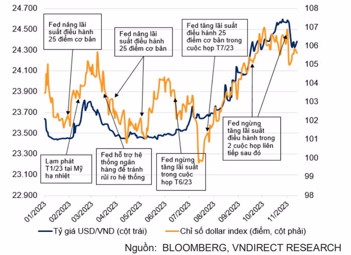 “Chúng tôi kỳ vọng tỷ giá USD/VND sẽ tiếp tục hạ nhiệt trong giai đoạn cuối năm 2023 do FED có thể tạm dừng chu kỳ tăng lãi suất và kỳ vọng tỷ giá USD/VND sẽ dao động trong khoảng 24.300-24.400”, các chuyên gia của VNDirect dự báo.