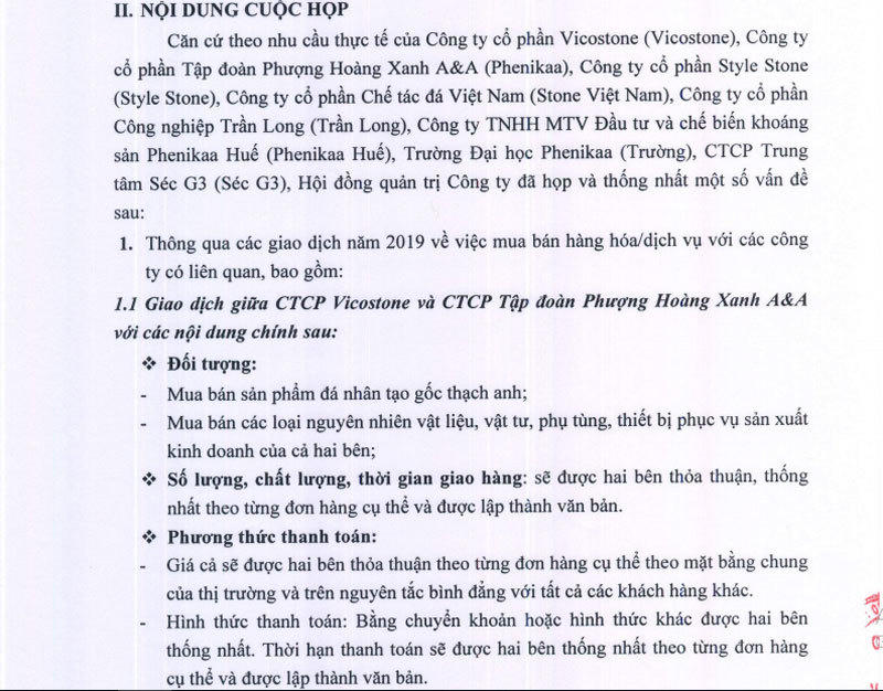 CTCP Vicostone (VCS) của ông Hồ Xuân Năng (thường được gọi với cái tên “Năng Do Thái”) vừa công bố biên bản họp HĐQT thông qua các giao dịch năm 2019 về việc mua bán hàng hóa/dịch vụ giữa VCS và các công ty liên quan. Đây đều là các doanh nghiệp liên quan tới ông Hồ Xuân Năng, do ông Năng làm chủ tịch HĐQT hoặc là thành viên có lợi ích liên quan.