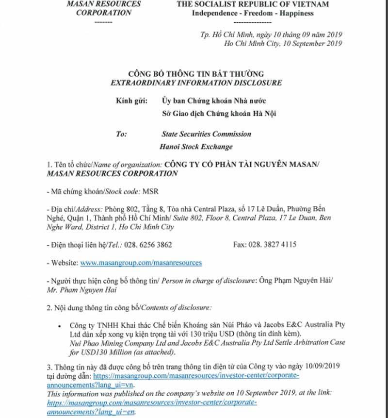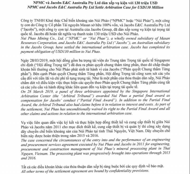 CTCP Tài nguyên Masan (Masan Resources) vừa công bố thông tin công ty con (MR sở hữu 100% vốn) - Công ty TNHH khai thác chế biến khoáng sản Núi Pháo (Núi Pháo) đã thắng kiện và nhận 130 triệu USD từ một đối tác Australia sau tranh chấp thực hiện hợp đồng thiết kế và cung cấp thiết bị chế biến khoáng sản.