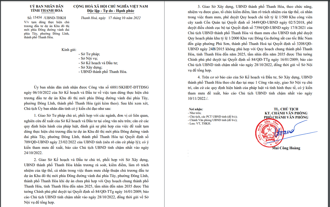 Cụ thể, UBND tỉnh Thanh Hoá cho biết, ngày 6/10 UBND tỉnh đã nhận được công văn của Sở Kế hoạch và Đầu tư, đề xuất về việc tạm dừng thực hiện chủ trương đầu tư dự án này. Vì vậy, tỉnh giao Sở Tư pháp đánh giá sự phù hợp của đề xuất, nêu rõ căn cứ pháp lý, có ý kiến tham mưu đề xuất, báo cáo Chủ tịch UBND tỉnh chậm nhất ngày 24/10.