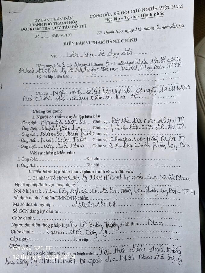 Ngày 10/6, Đội kiểm tra quy tắc đô thị thành phố Thanh Hóa đã có Biên bản vi phạm hành chính về lĩnh vực đất đai đối với Công ty TNHH thiết bị giáo dục Nhật Nam (Công ty giáo dục Nhật Nam).