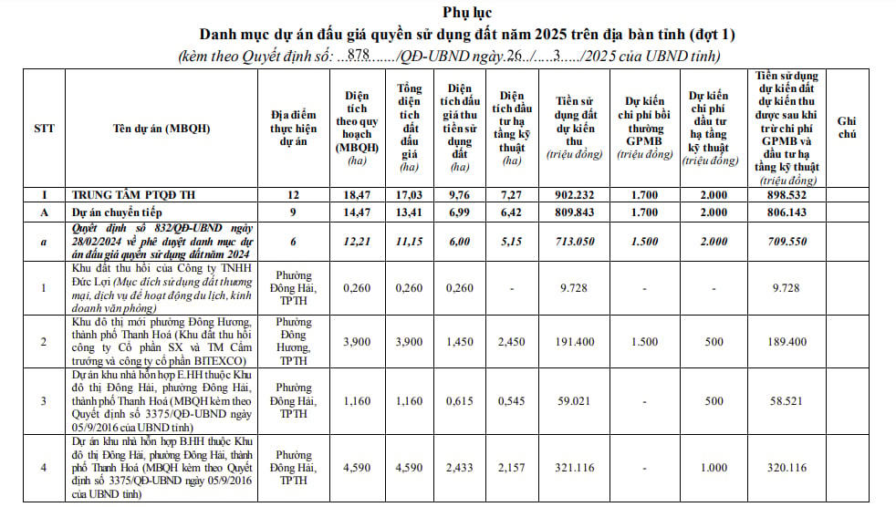 Phụ lục kèm theo quyết định cho thấy Trung tâm phát triển Quỹ đất Thanh Hóa phụ trách nhiều dự án quan trọng. Tiêu biểu như dự án chuyển tiếp tại phường Đông Hương, diện tích quy hoạch 3,9ha, tổng diện tích đất đấu giá 1,45ha, tiền sử dụng đất dự kiến thu là hơn 191,4 tỷ đồng. Hay tại phường Đông Vệ, diện tích quy hoạch 2,26ha, tổng diện tích đất đấu giá là 1,2ha; tiền sử dụng đất dự kiến thu là hơn 129,3 tỷ đồng.